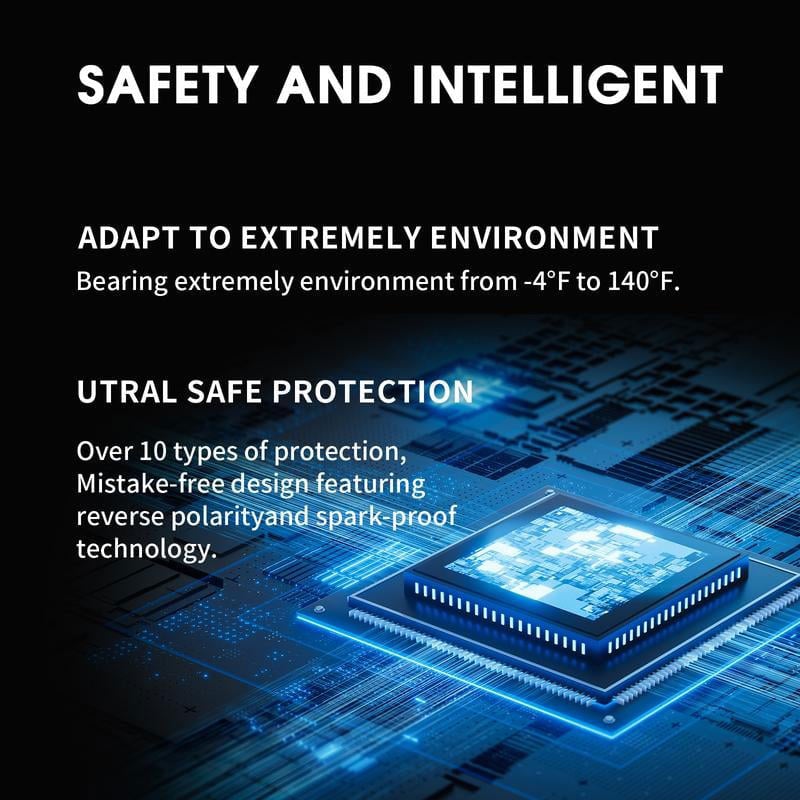 【10 Intelligent Secure Protection & Stable Operation】: Our car jump starter have 10 protection systems (reverse polarity, reverse charge, over discharge, reverse connection, short circuit, over charge, over current, over heat, spark resistance). High Power jump pack for car battery ensure your safety during using and the jump pack can work in -22°F ~ 140°F, even in any extreme weather.
