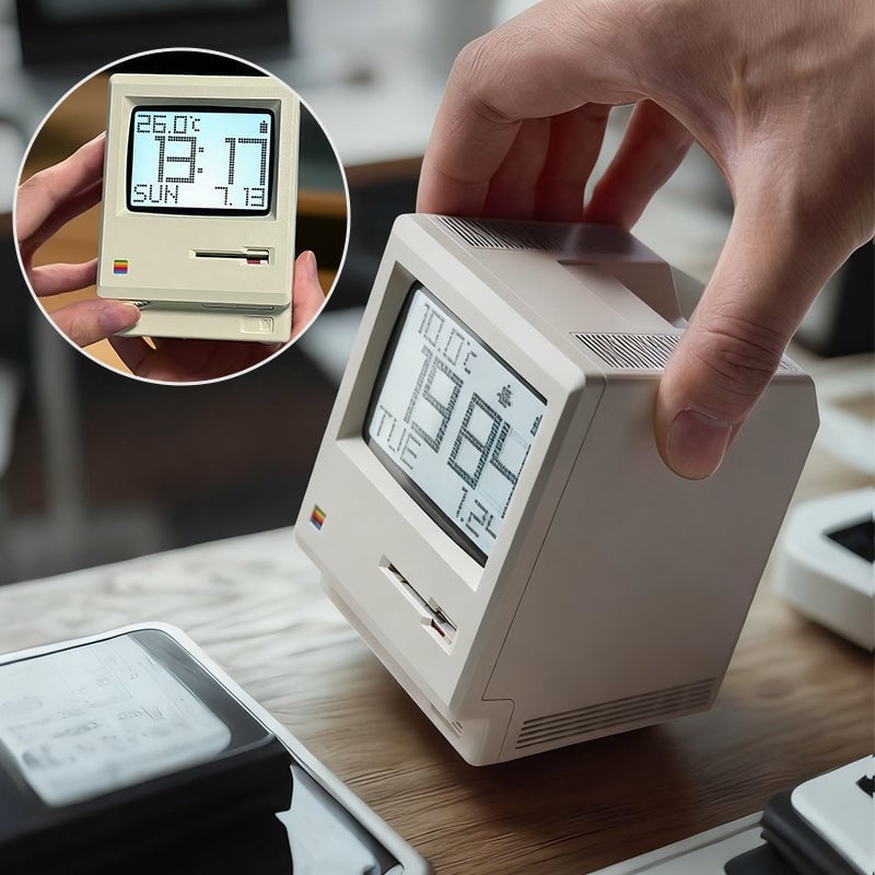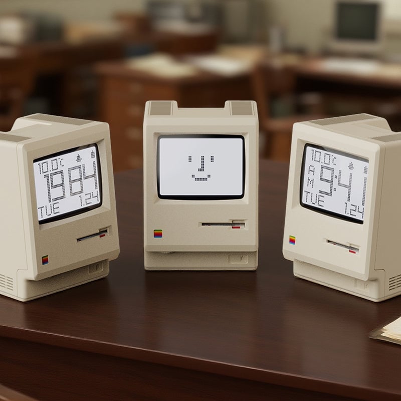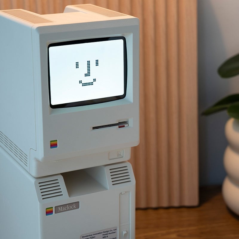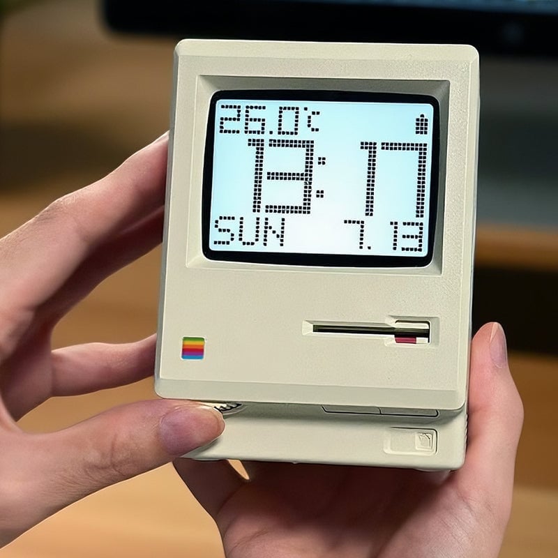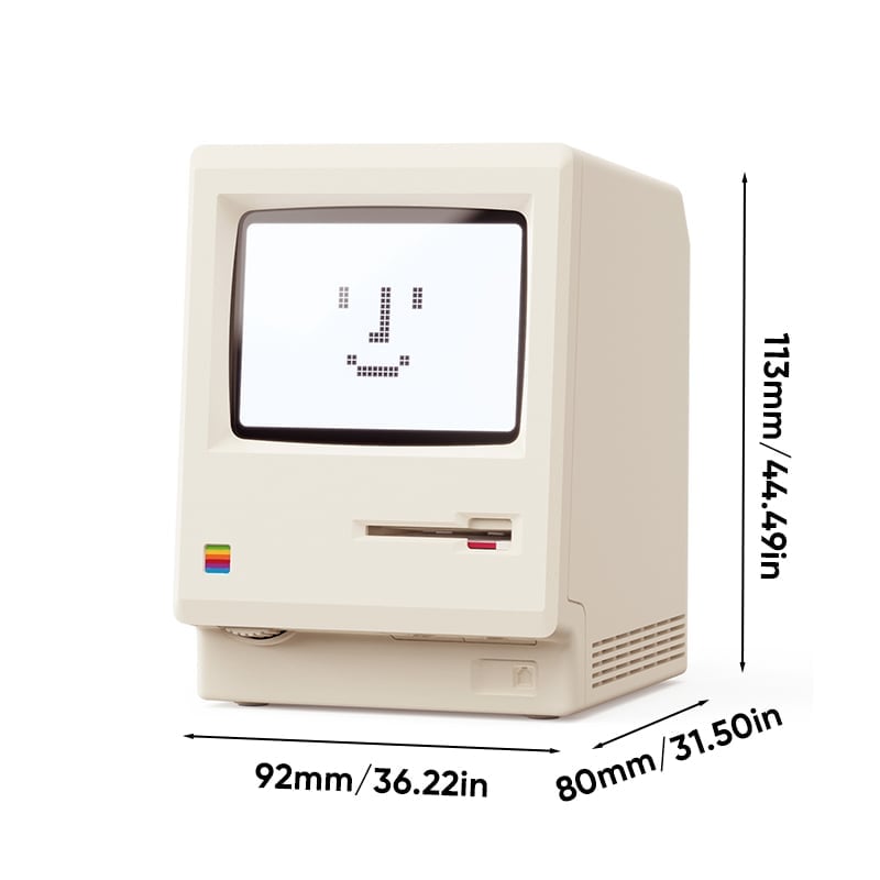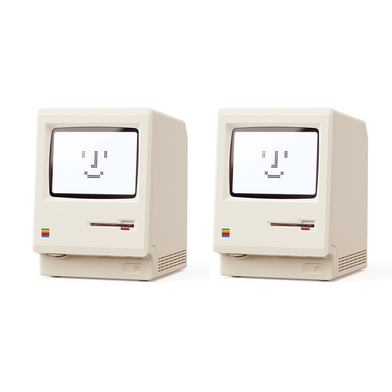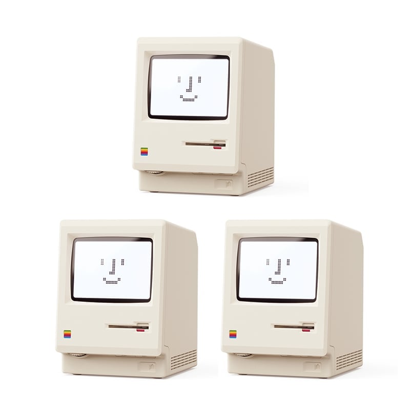 This vintage cream digital alarm clock pays tribute to the iconic 1984 all-in-one computer: scaled down in true proportion, complete with the signature startup smile, disk-insert boot animation, brightness dial, and chunky pixel-style dot-matrix display that recreates the original computer experience.