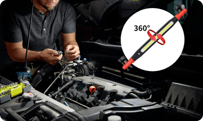 Lamp rotates freely (360°/180° tilt) to shine into every corner — ideal for tire, chassis, and workshop tasks.